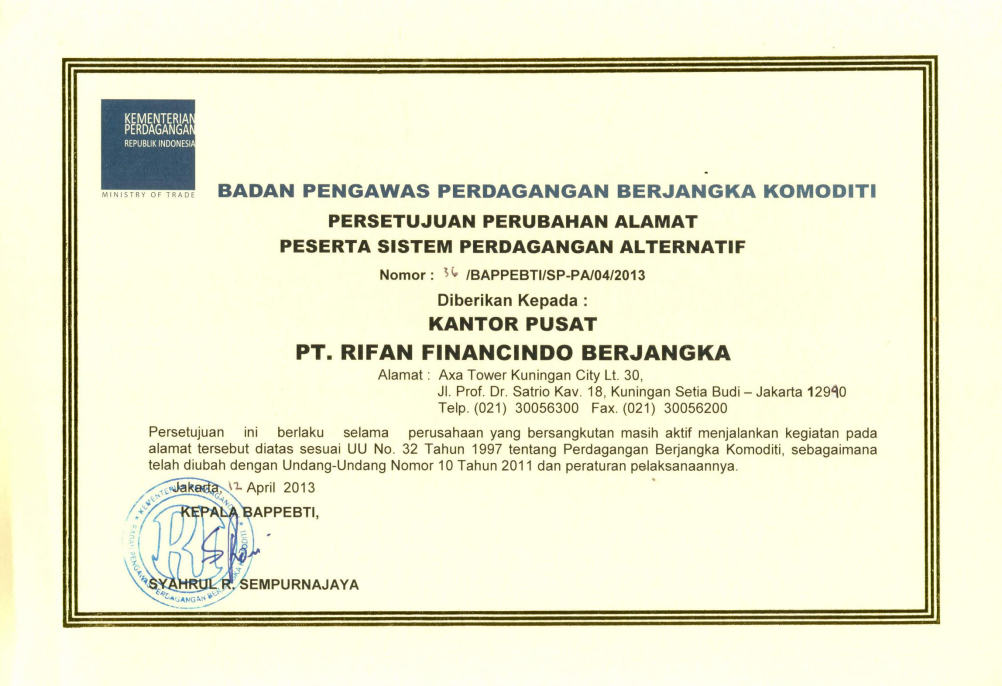 PT Rifan Financindo Berjangka (“RFB”) berpengalaman lebih dari 20 tahun di industri Perdagangan Berjangka Komoditi dan merupakan perusahaan pialang terbesar dengan menduduki posisi teratas dari 10 perusahaan pialang berjangka teraktif dari PT Kliring Berjangka Indonesia (Persero). Selain anggota dari KBI (Persero), PT Rifan Financindo Berjangka juga merupakan anggota PT Bursa Berjangka Jakarta dan terdaftar resmi di Badan Pengawas Perdagangan Berjangka Komoditi (BAPPEBTI). Sejak tahun 2000, PT Rifan Financindo Berjangka terus berkembang dengan jumlah kantor operasional sekarang di Jakarta (2 kantor), Bandung, Semarang, Solo, Yogyakarta, Surabaya, Medan, Pekanbaru dan Palembang.